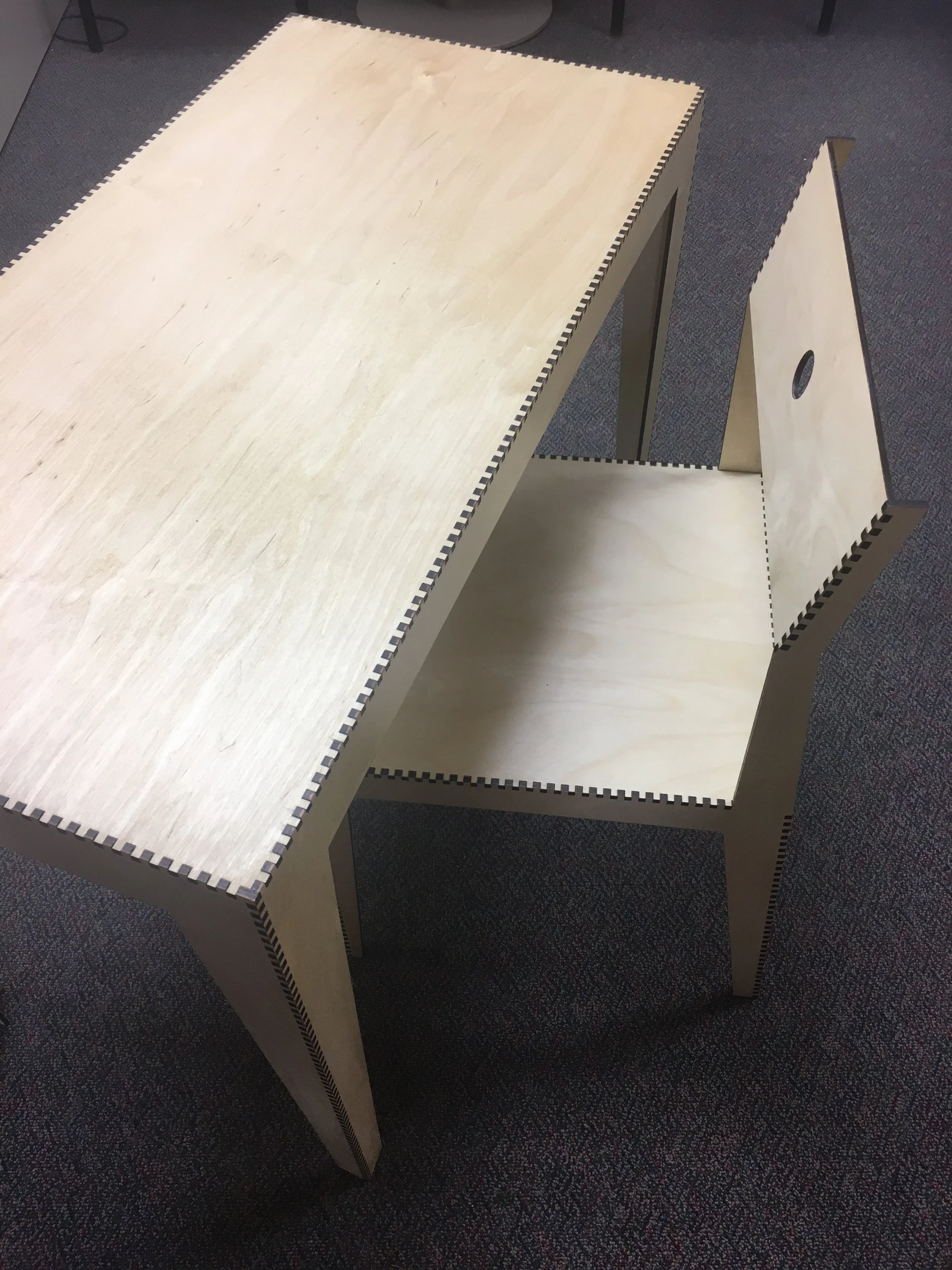Laser cut 5 mm. Baltic birch plywood. The chair is extremely lightweight and surprisingly very structural. Burnt edge of plywood adds the beautiful checker board edge detail.