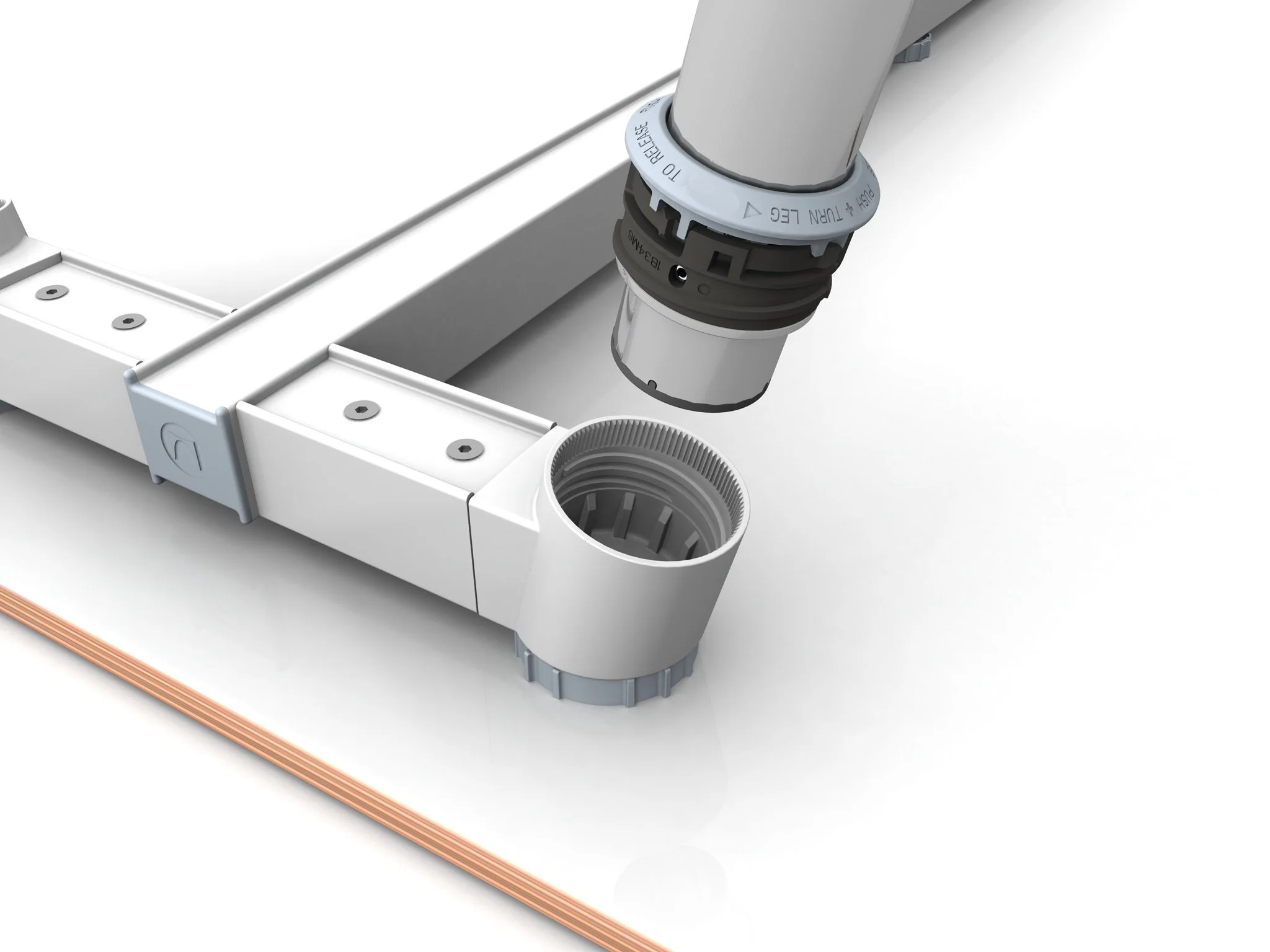 3D Renders of Sense table legs going into frame without any tools. Simply insert leg and twist it tight. Tabletop would connect to the frame with a turn of the locking ring.